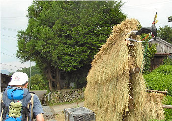 音無(おとなし)茶の茶畑に、刈り取って干してある稲束。飾り気のない小さな王子跡が、涼しい気分にさせた。