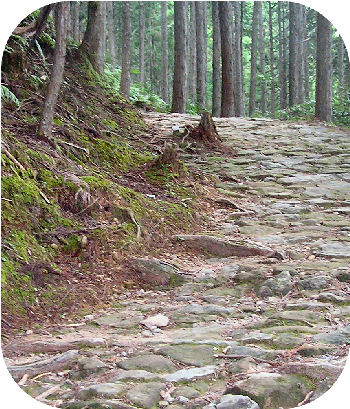 本日は発心門王子を起点に熊野本宮大社までの路7`。翌日は新宮の高野坂1.5`、ぼくの生れ故郷で熊野灘沿いの峠越えである。 |