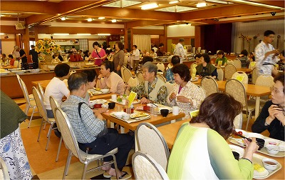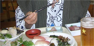 到着日、本館1階大宴会場・パレス竜宮での夕食は、まぐろまぐろの豪華絢爛バイキングだった。残念ながら食べることにかまけて、写真はこれしかない。 |