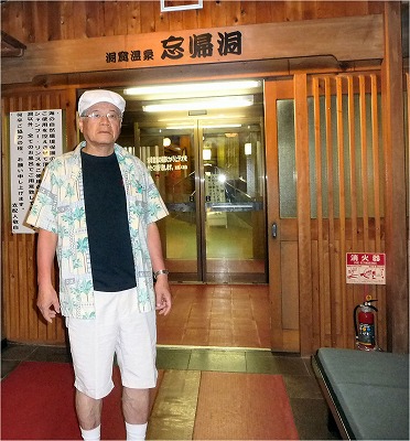 もう一方の洞窟温泉「玄武洞」もいい。前は「亀の湯」といっていたはずだ。その連想で今の名前になったと解釈した(玄武は亀と蛇の合体で、四神の一翼。方角は北、色は黒、四季は冬)。 |