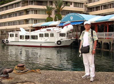 勝浦港船着き場からホテル直営の連絡船「浦島丸」で渡る。およそ10分。
